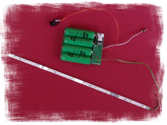 Zastosowano 4 "paluszki" NiMH rozmiaru AA. W celu zminimalizowania gabarytów użyto baterii z "wąsami" do przylutowania do płytki. Mikroprocesorowy układ kontroluje proces rozładowania (wyłącza świecenie przy zejściu poniżej określonego progu napięcia) oraz proces ładowania (ogranicza napięcie i czas). Do włączania i wyłączania świecenia zastosowano monostabilny łącznik miniaturowy. Napięcie potrzebne do zasilania taśmy LED uzyskuje się dzięki zastosowaniu przetwornicy. Daje ona napięcie stałe niezależne od stopnia rozładowania baterii. Układ przetwornicy zaprojektowano tak, aby można było go łatwo przerobić na źródło prądowe - wówczas przy zastosowaniu specjalnie skonstruowanego paska LED (zamiast standardowej taśmy) uzyska się nieco wyższą sprawność - teoretycznie można liczyć na 15% dłuższy czas świecenia dla diod białych, niebieskich lub zielonych i około 30% dla czerwonych.